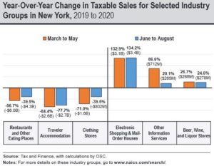 Year over year change in taxable sales for selected industry groups in New York 2019 to 2020